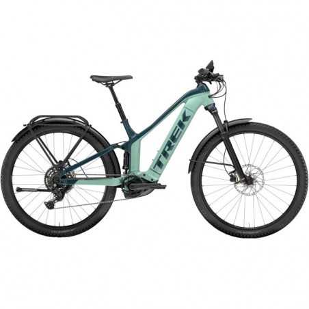 Product Name: Trek POWERFLY FS 4 EQUIPPED GEN 3 - Electric Mountain Bike - 2025 - 27.5" - Blue Sage/Juniper Manufacturer: Trek Bikes activity: Cycling gender: men material: Aluminium usage bikesport: Trekking, E-Bike, MTB hubs: Bontrager | 6-Bolt | Boost rims: Bontrager Kovee | 23mm chain: Shimano LG500 cassette: Shimano CUES LG300 | Linkglide shifter: Shimano CUES U4000 rear derailleur: Shimano CUES U4000 chainring ratio: 36 crankset: FSA Bosch CK-220 brakes: Tektro HD-M275 | 203mm seat post model: TranzX JD-YSP18 | 130mm Travel saddle: Bontrager Commuter Comp handle bar: Bontrager Aluminum | 31.8mm | 720mm stem: Bontrager Comp | 31.8 mm | 7° fork: SR Suntour XCR 34 | Air Spring | 44mm Offset headset: FSA IS-2 frame: Alpha Platinum Aluminium Shifting System (Manufacturer): Shimano gear ratio: 11-46 Battery capacity: 625Wh Shifting Type: Chain - Mechanical E-Bike battery: Bosch PowerTube 625 Wh Drive Unit Manufacturer: Bosch Motor : Mid-Mounted Motor, Full Assist bike extras: with Lighting System, with Fender , with Carrier brake type: Disc Brake wheel size: 27,5" / 650B (584mm) bike special accessories: carrier | mudguards | kickstand bike lights: Herrmans H-Black MR8-E | Supernova E3 Mini-2 grips: Bontrager XR Endurance Comp shock: SR Suntour Edge R | 190 mm x 45 mm seatpost: Dropper post Rear Triangle: Suspended travel fork: 100mm pedals: VP-536 tires: Bontrager LT4 Expert - Wire Bead Tire | 60 TPI | 27.5" x 2.40" max. system weight: 136kg brake actuation: Hydraulic Model year: 2025 Collection: Full year Color: Blue, Turquoise fork construction: Classic Suspension Fork weight: 26650g manufacturer item code: 5292232 | 5292233 cable routing: internal Weight Source: Manufacturer Display / Control Unit: Bosch Purion 200 Drive Unit Model: Bosch Performance Line CX Torque: 85Nm Number of Gears: 1 x 9 Frame Shape: Diamond GTINs: 768682195673, 768682195376.